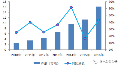 2016年,我國(guó)鋰電池正極材料產(chǎn)量為16.16萬(wàn)噸,同比增長(zhǎng)43.14%;2010年至2016年,年復(fù)合增長(zhǎng)率高達(dá)36.48%。行業(yè)產(chǎn)值則從2010年的57億元增長(zhǎng)到2016年的208億元,年復(fù)合增長(zhǎng)率高達(dá)24.08%。