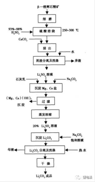 硫酸法工藝在工業(yè)生產(chǎn)上常用,鋰礦經(jīng)過磨細(xì)-焙燒-浸出后,加入硫酸鹽除雜過濾,得到硫酸鋰溶液。利用該溶液制備沉淀的碳酸鋰后洗滌干燥獲得產(chǎn)品。該方法產(chǎn)率較高,且對鋰礦品位要求不高。硫酸法工藝也同樣可以處理鋰云母。