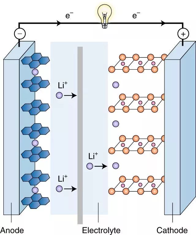 每個電池都有正負兩極,正負極通過電解質進行隔離,并將電能以化學能的形式儲存于兩極之中。兩極之間發生的化學反應產生離子和電子,離子在電池內部傳遞,并逼迫電子在電池外部傳遞,形成回路,從而產生電能。
